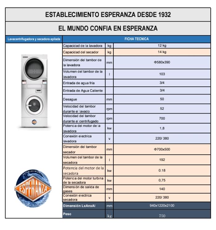 Especificaciones de los tipos y modelos de maquinaria para lavandería